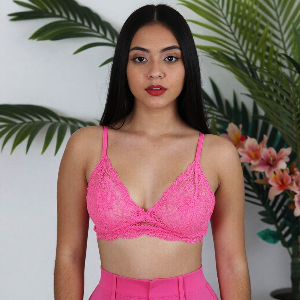 Photograph of a young woman with long, straight black hair and medium brown skin, standing against a white background with green palm leaves and pink flowers on the right. She has dark, arched eyebrows, full red lips, and is wearing a bright pink, lace-patterned, V-neck bralette that reveals her cleavage, paired with high-waisted, pink pants. Her expression is neutral, and she gazes directly at the camera. The lighting is even, highlighting her smooth skin and the vivid colors of her outfit and the background elements.