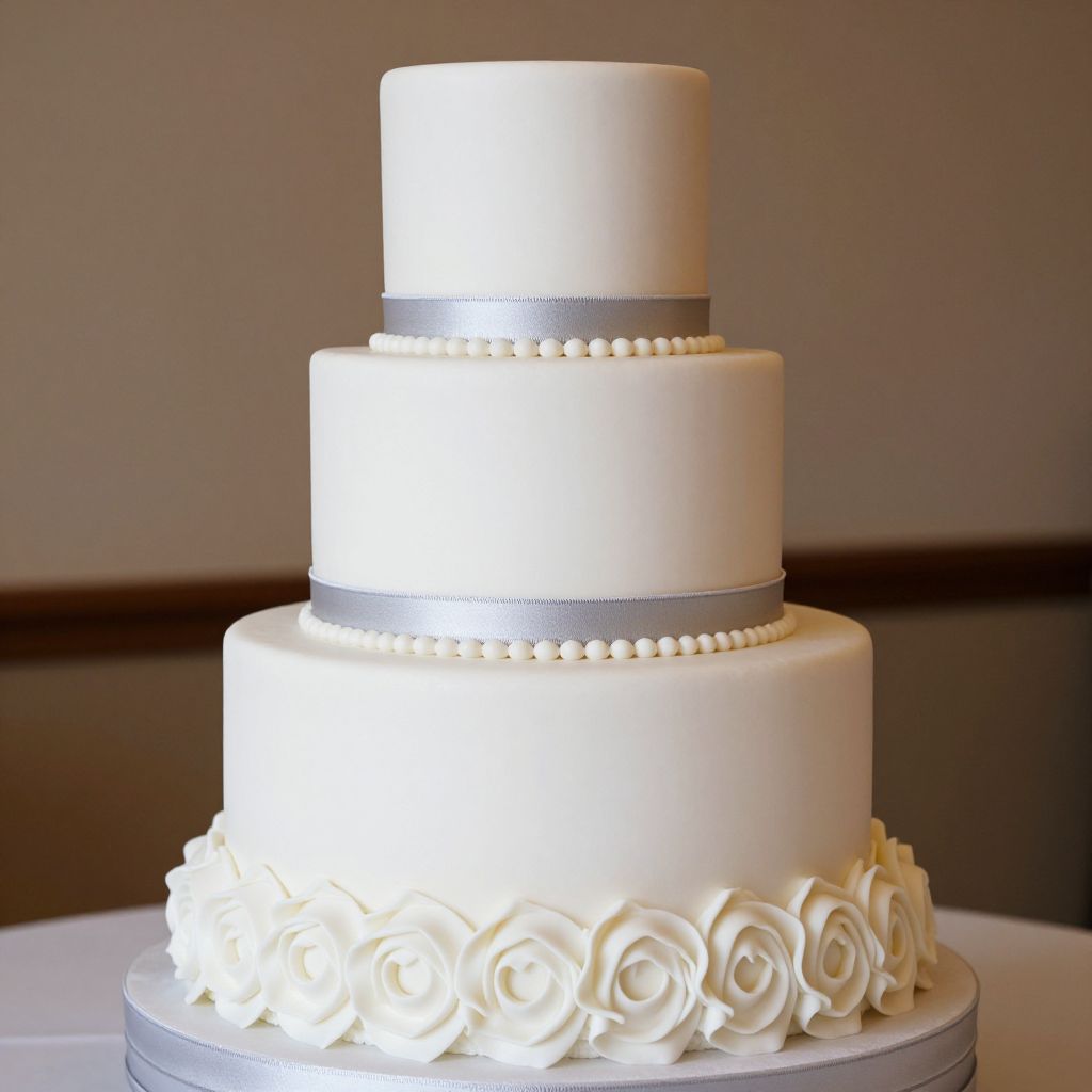 Elegant three-tiered wedding cake featuring smooth white fondant tiers, adorned with a delicate silver ribbon and a bottom tier embellished with meticulously crafted rosettes, creating a sophisticated and timeless design.