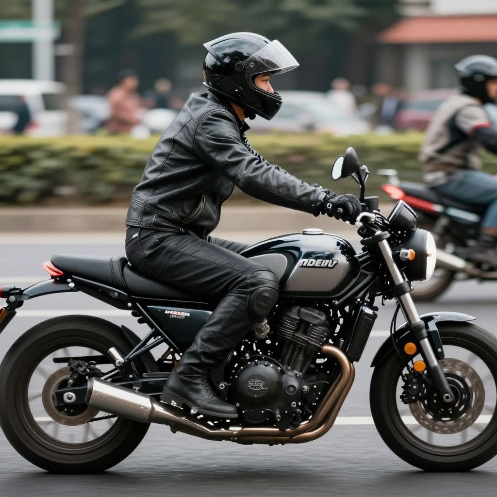 Photograph of a motorcyclist in black leather gear and helmet, riding a silver Honda motorcycle on a busy street, with blurred background and another motor