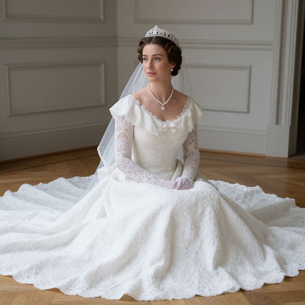 Photograph of a fair-skinned bride with dark brown, wavy hair, wearing a white, lace wedding gown with short lace sleeves and a fitted bodice. She has a delicate, sparkling tiara on her head and a white lace veil that drapes over her shoulders. She wears white lace gloves and a pearl necklace. She sits gracefully on a polished wooden floor with her dress spreading out behind her. The background features white, paneled walls, adding a classic, elegant touch to the scene. Her expression is serene, and the lighting is soft, emphasizing the purity and elegance of her attire.