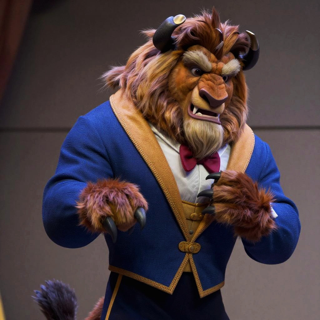 Beauty and the Beast, Roar of the Beast, Disney, cloathes, dynamic pose, ultra realistic faces, photorealism, RAW photo, full sharp, 8k uhd, dslr, soft lighting, high quality, film grain