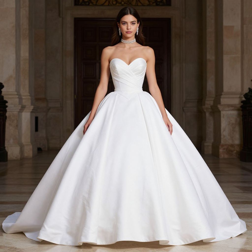 White ball gown costume, 1girl, solo, dress, white dress, jewelry, realistic, brown hair, standing, earrings, choker, long hair, full body, breasts