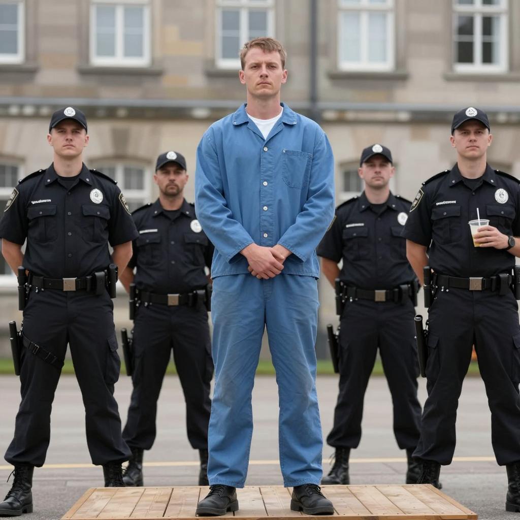 A man in a blue prison jumpsuit stands on a wooden platform, hands in front, surrounded by four guards in black uniforms and caps. Two guards stand on either side, one with hands on hips, the other holding a drink. The background shows a stone building with multiple windows. The man has a neutral expression. The image is a photograph.