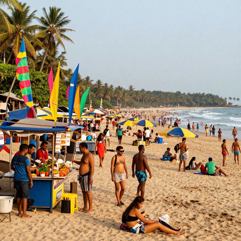 Goa beach prompt: A bustling goa beach during peak season, crowded with tourists, vibrant street food stalls, colorful flags, beach umbrellas, lively energy, people relaxing on sand, tropical sky, warm sunlight, dynamic scene.