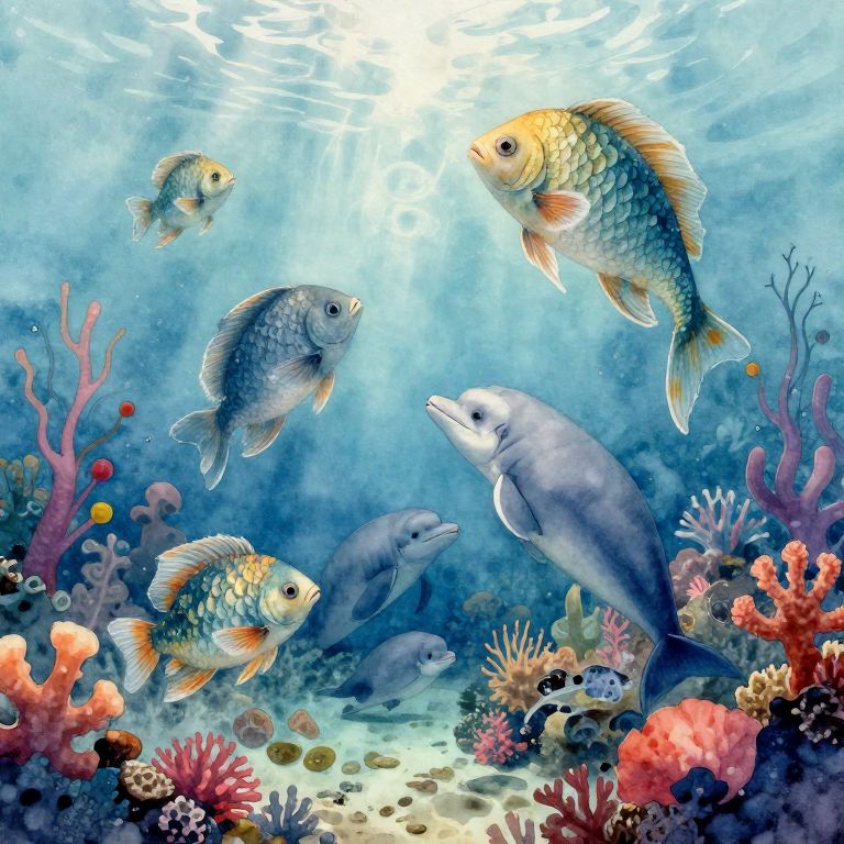 Vibrant underwater scene: colorful fish, dolphins, and coral reef with sunlight filtering through, creating a mesmerizing, detailed aquatic illustration.