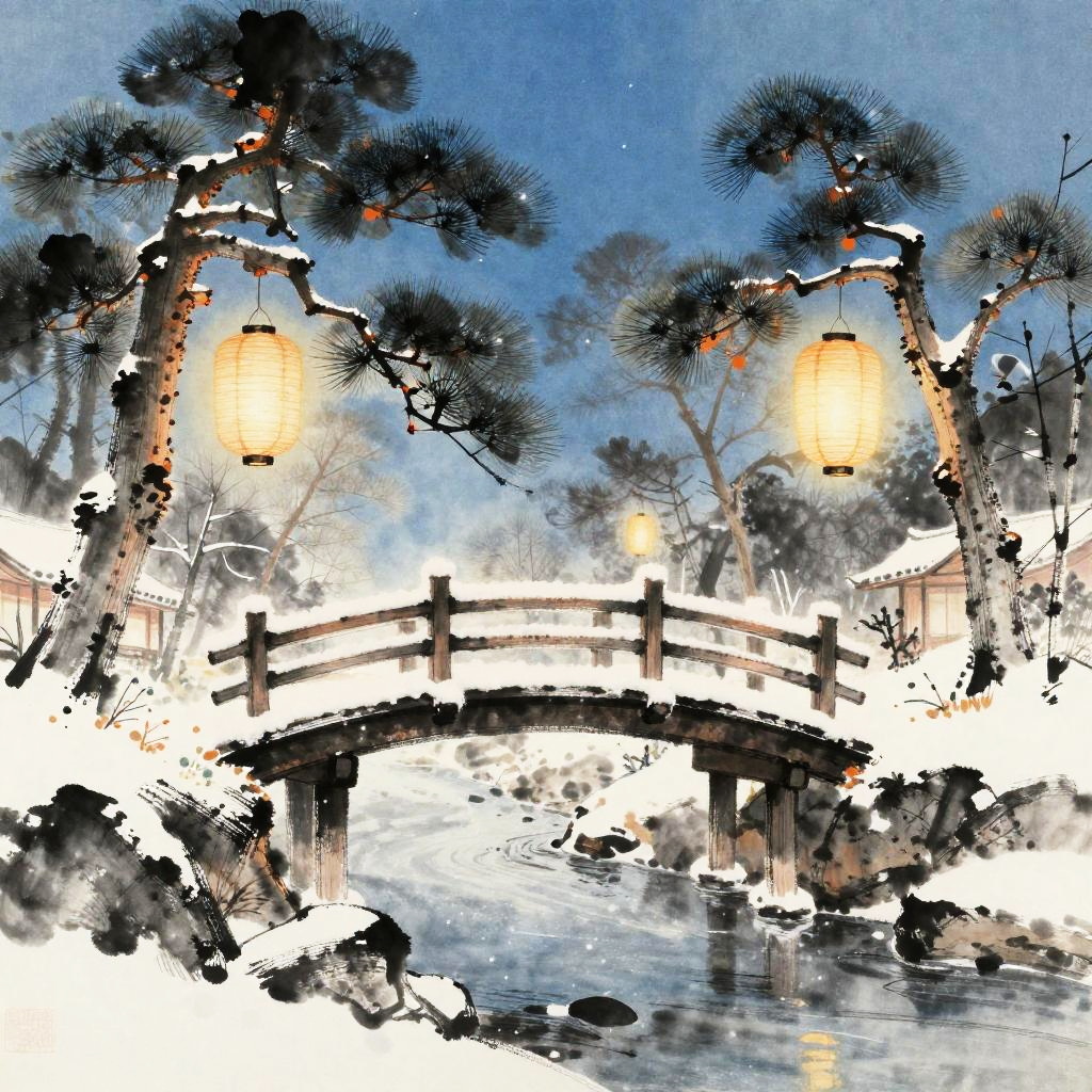 A hand-painted Art Nouveau gouache illustration of a glass conservatory filled with frosted roses and a small candlelit table, snow riming the curved glass dome, bathed in warm amber lantern glow mingled with crisp silver moonlight, evoking tranquil winter romance.