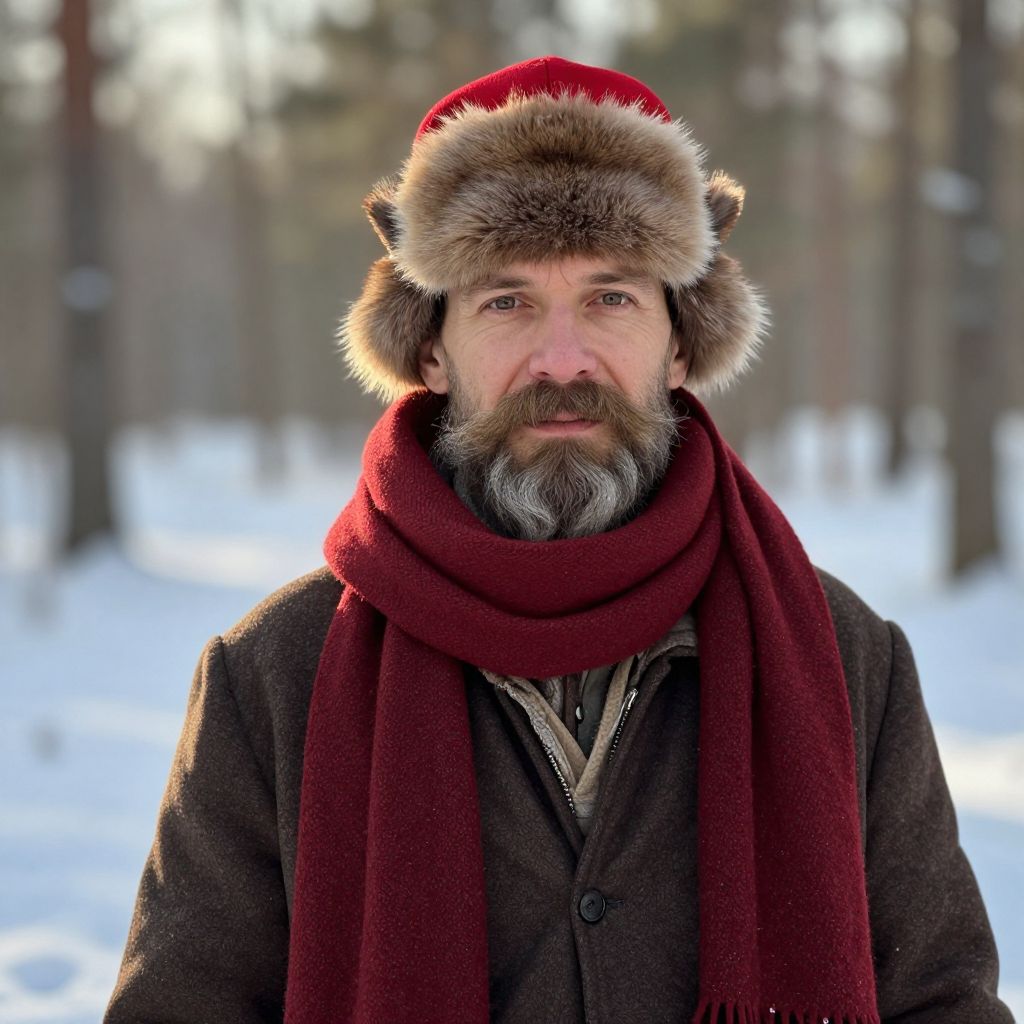 A man with a full beard and a well-groomed mustache stands confidently in a winter setting, wearing a vibrant red hat with a fur cuff that adds warmth and character, and a rich red scarf wrapped neatly around his neck. The scarf flares slightly in the breeze, adding movement and depth to the scene. He has a weathered yet friendly facial expression, with a hint of wisdom in his eyes, standing in a snowy forest clearing with soft morning light filtering through the trees. The atmosphere is cozy and authentic, blending rustic charm with a touch of timeless elegance.