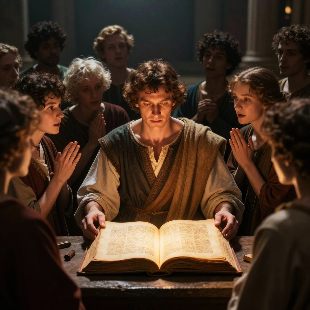 Seminal moment in history illustrated as a dramatic scene with people gathered around a glowing manuscript, expressions of awe and revelation, richly detailed, cinematic lighting, realistic style with a touch of impressionism