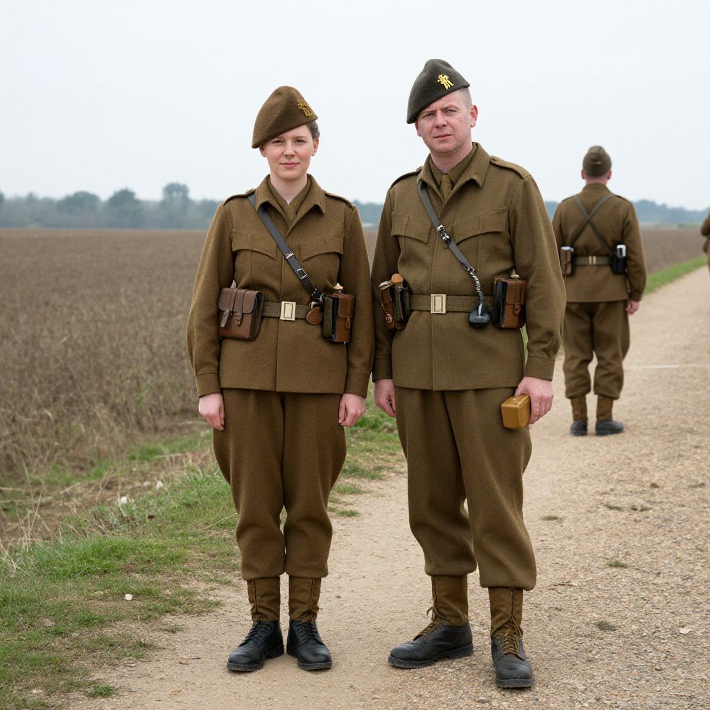 Two individuals, identified as Forewoman Milnes and Captain Pope of Queen Mary's Army Auxiliary Corps Signallers, stand side by side on a dirt path near a field at Base Hill, Rouen, with Captain Pope holding a telephone case and a third person in military attire visible in the background.