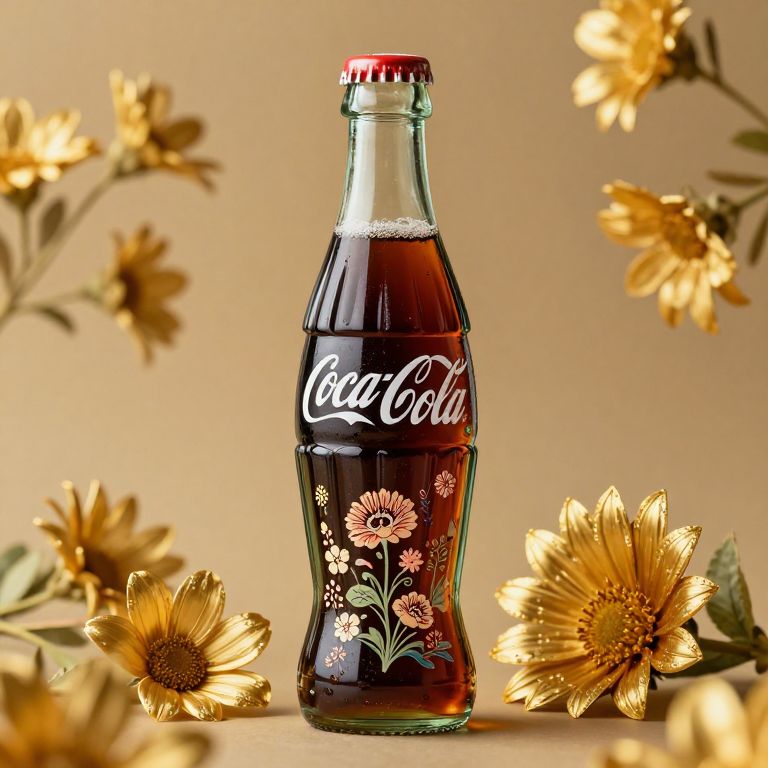 A decorative Coca-Cola bottle with intricate floral designs and a red cap, surrounded by golden flowers.