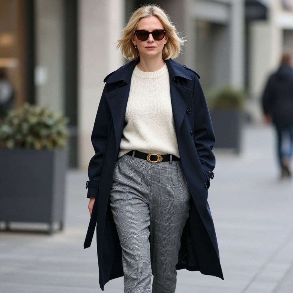 Photograph of a blonde woman with shoulder-length hair, wearing black sunglasses and a navy blue, long, belted trench coat over a white, chunky-knit sweater. She pairs the top with high-waisted, gray, checkered trousers, cinched at the waist with a black belt featuring a gold buckle. She walks confidently down a city sidewalk, with blurred background elements including gray buildings, potted plants, and a faintly visible pedestrian. The overall style is chic and modern, with a focus on neutral and dark colors. The image has a sharp focus on the woman, with a shallow depth of field.