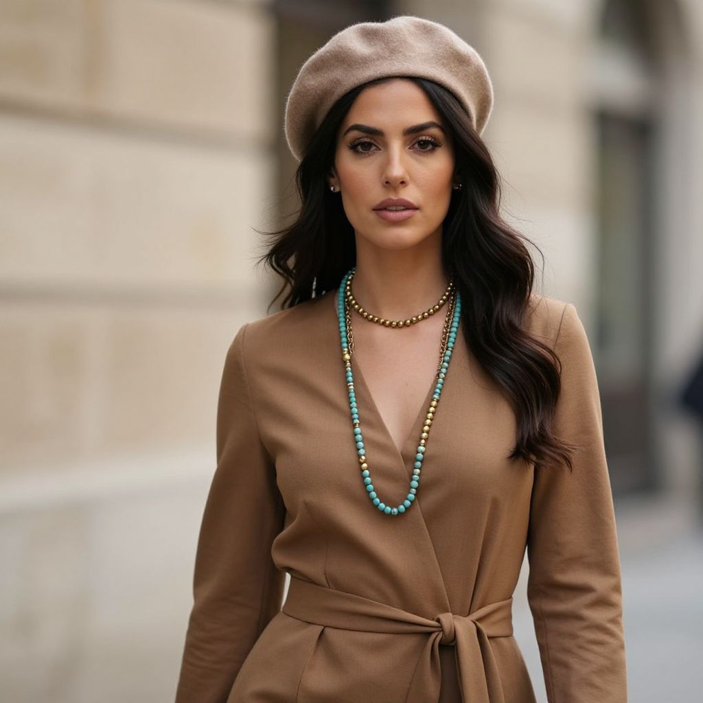 Photograph of a confident woman with long, dark hair, wearing a light brown beret and a long-sleeved, brown belted dress. She accessorizes with layered necklaces, including turquoise and gold beads. She stands against a blurred urban background with beige stone walls. Her makeup is subtle, and she gazes directly at the camera with a serious expression.