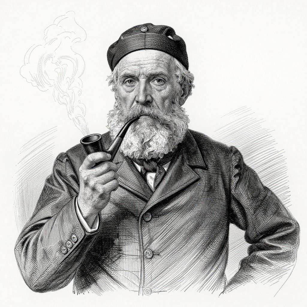 The image is a detailed, black-and-white sketch of an elderly man, likely from the Victorian era, given his attire and the style of the illustration. He is depicted with a weathered face, deep-set eyes, and a thick, bushy beard that adds to his rugged appearance. The man is wearing a cap with a button and a uniform, suggesting he might be a sailor or a worker. He is holding a pipe in his right hand, from which smoke is emanating, adding a sense of realism to the sketch. The man's left hand is resting on his hip, and he is wearing a jacket with buttons and a scarf tied around his neck. The overall composition is balanced, with the man's face and upper body occupying the central focus, while the background is left plain to emphasize the subject. The sketch is executed with fine lines and shading, capturing the textures of the man's clothing and facial hair with great detail.