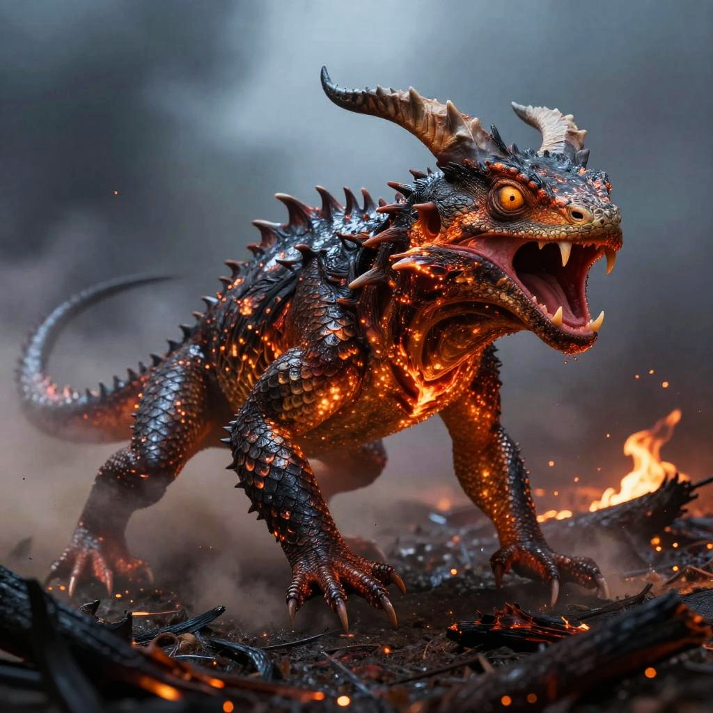 Ember-lizard creature with scales reflecting flickering firelight and sharp horns, lunging through a haze of glowing ash and fiery particles, charred battlefield strewn with burning debris at dusk, action shot, skin pores, very dark lighting, heavy shadows, detailed face, vibrant, photorealistic, dramatic, sharp focus, 8k, (intricate:1.4), decadent, (highly detailed:1.4), digital painting, concept art, octane render, artstation, smooth illustration, global illumination, studio light, volumetric light, atmospheric fog, particles floating, embers, wet surfaces, rim light, depth of field