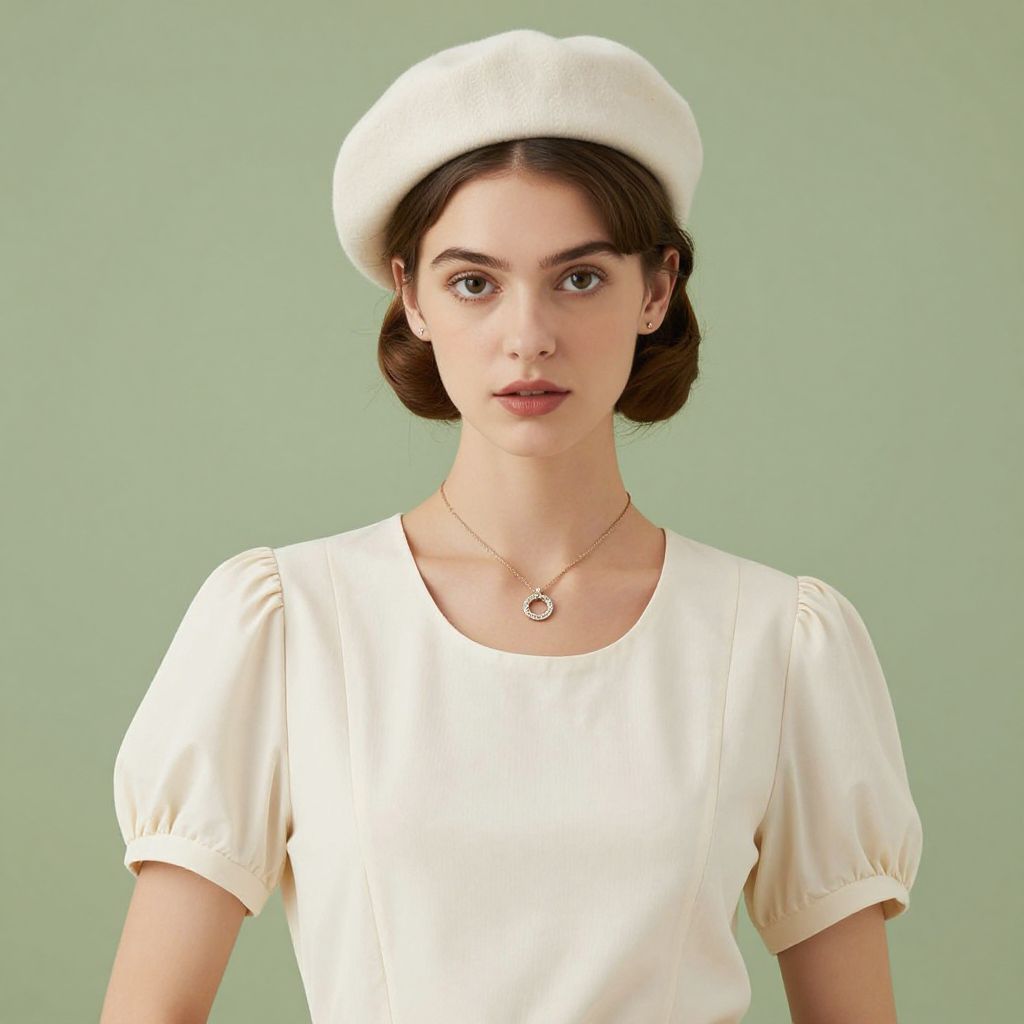 Elegant portrait of a woman in a vintage-inspired ensemble, featuring a cream-colored beret atop neatly styled hair, a matching short-sleeved blouse with puffed shoulders, and a delicate necklace with a circular pendant, captured against a soft green backdrop.