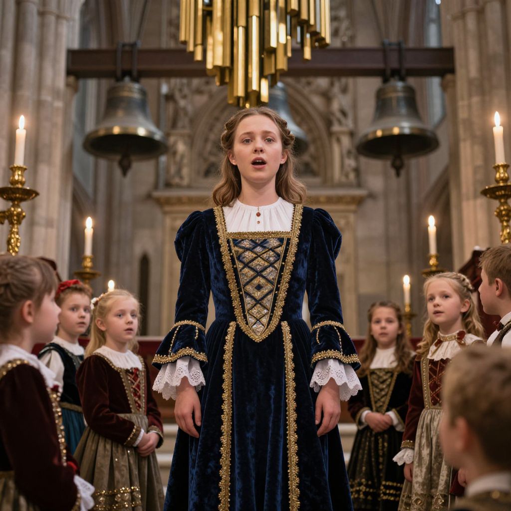 Realistic photography of a young Victorian carol singer in a meticulously crafted costume of deep blue velvet with gold trim and lace cuffs, standing on a grand staircase of an old cathedral, her face beautifully defined with soft features — high cheekbones, fair complexion, and a shy but determined expression — singing a traditional carol as children in period dress gather around her, the setting illuminated by golden candlelight and soft chimes from the church bells