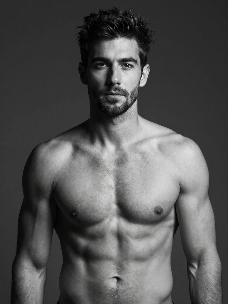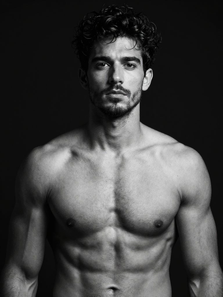 Shirtless male fitness model portrait, mid 30s man, messy curly black hair, athletic muscular build, short boxed beard, calm confident look, dramatic high-contrast chiaroscuro lighting, simple dark studio backdrop, black and white photography, sharp detail on muscles, cinematic studio shot, high resolution