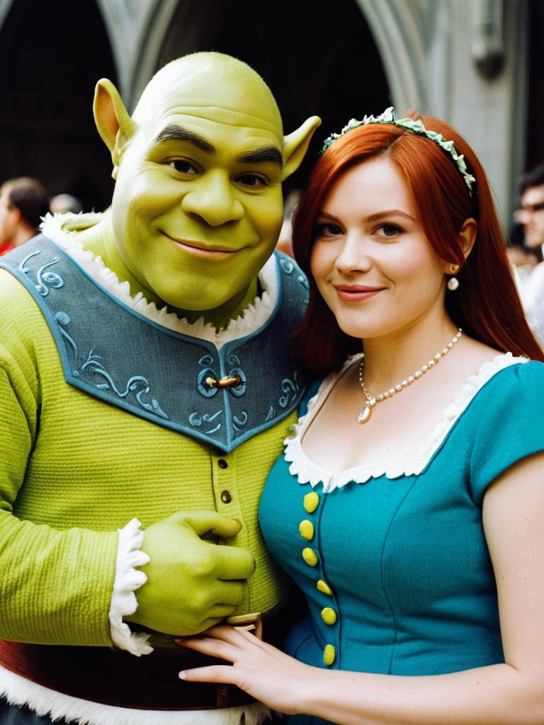 Couple in Shrek and Fiona Costume, candid cosplay portrait at themed event