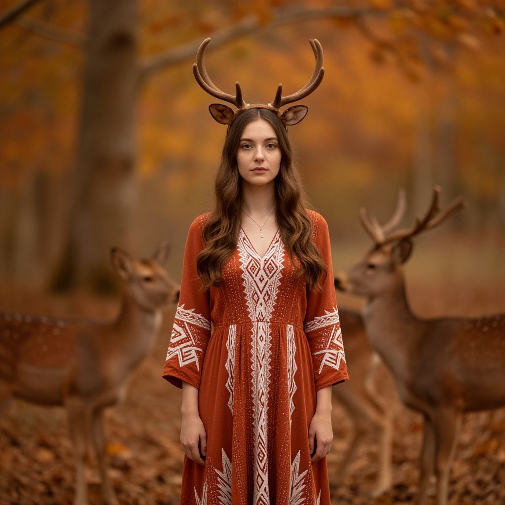 Photorealistic image of a young woman with long brown hair wearing a rust-colored dress with white geometric patterns and a deer antlers headband. She stands in an autumn forest surrounded by deer, with warm fall colors and soft lighting creating a serene and ethereal atmosphere.