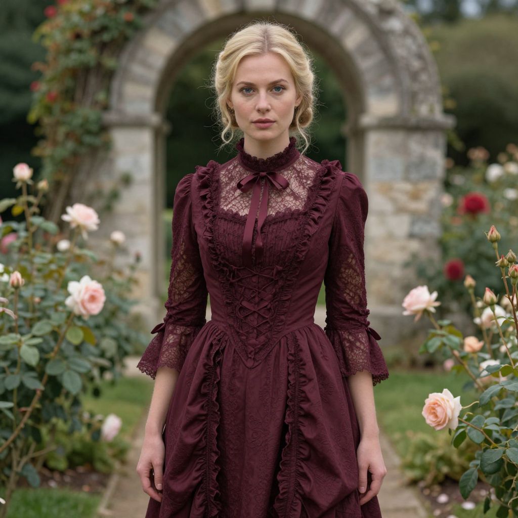 Photograph of a blonde woman with fair skin and blue eyes, standing in a lush garden. She's wearing a Victorian-style, deep burgundy dress with lace detailing, a high neckline, and a ribbon bow at the chest. Her hair is styled in an elegant updo. The background features a stone archway and blooming roses. The image has a slightly surreal, polished look.