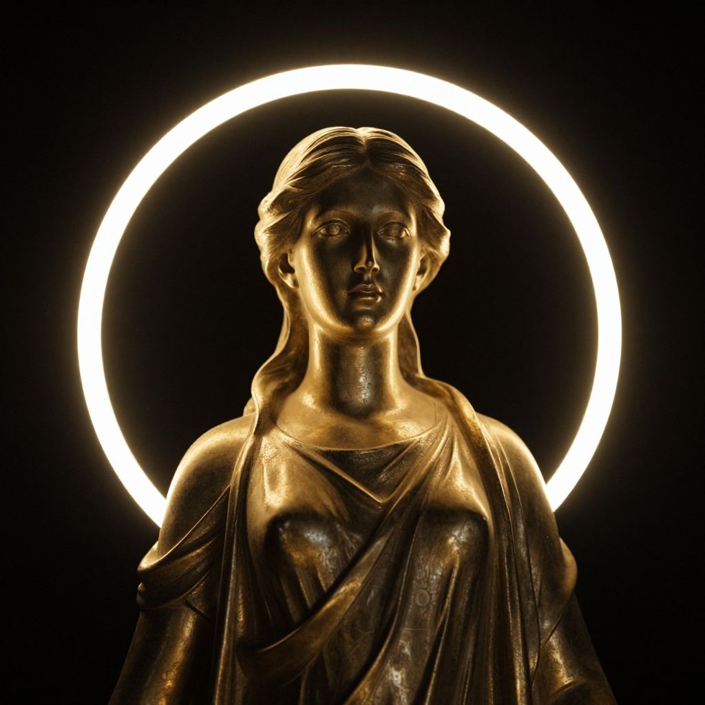 Photograph of a bronze statue of a serene woman with classical features, wearing a draped garment. The statue has a smooth, shiny texture and realistic details. She has long, slightly wavy hair, and her expression is calm and composed. A bright, circular white light ring is illuminated in the dark background, highlighting the statue and creating a halo effect. The contrast between the dark bronze and the bright light accentuates the statue's form and features. The overall composition is striking and evocative, emphasizing the statue's timeless beauty and the light's dramatic effect.