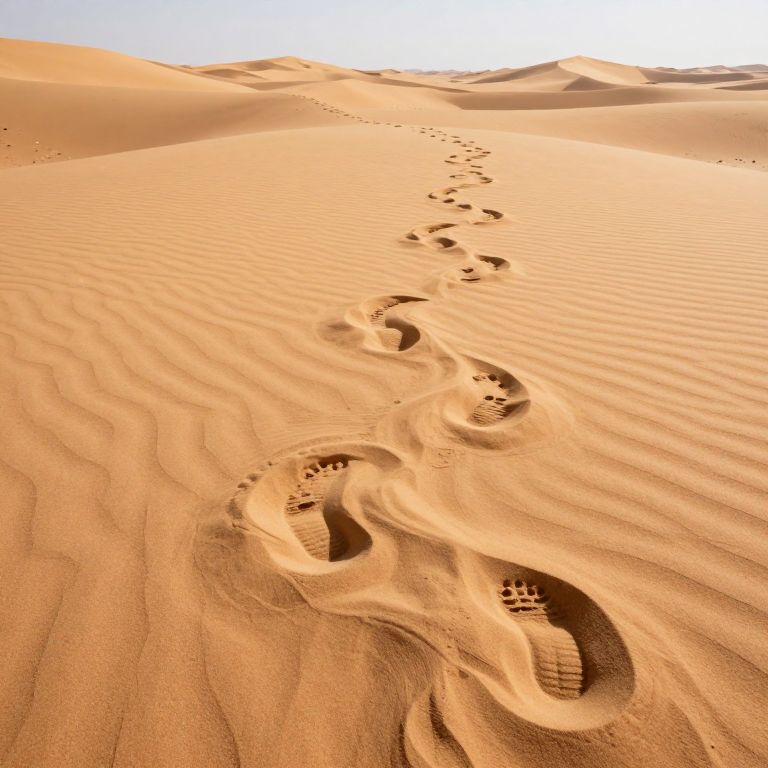 A surreal desert landscape where footprints etched into the sand transform into an endless cascade of swirling, organic forms, defying gravity and logic as they stretch toward the horizon.