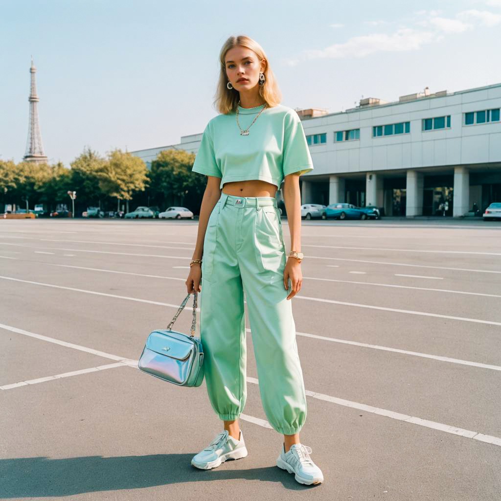 Blonde woman with long legs wearing a celadon pastel y2k-inspired outfit consisting of a baby tee crop top and low-rise pants. She accessorizes with chunky white sneakers, metallic jewelry, and carries a shiny nylon handbag. The background features a large parking lot and a distant structure resembling the Eiffel Tower, suggesting a French urban location.