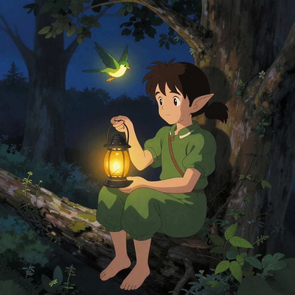 Digital anime-style illustration of a young elf-boy with brown hair, green tunic, and bare feet, holding a glowing lantern, sitting in a dark