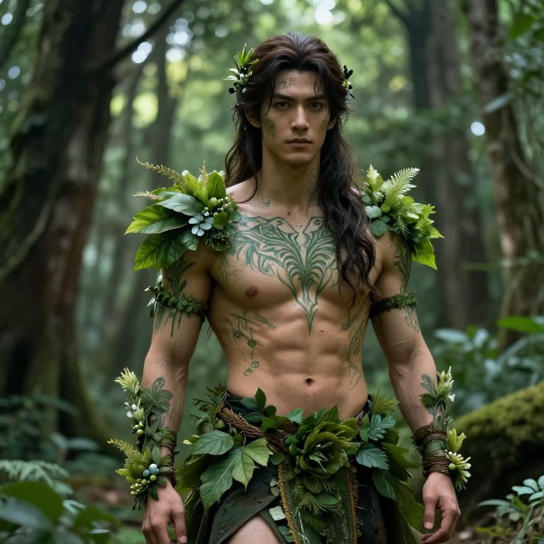 Photorealistic CGI of a muscular, shirtless man with long dark hair, wearing leaf and flower armor, standing in a lush forest. Intricate