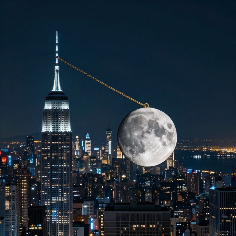 The Moon is tethered to a skyscraper by a golden chain, swaying gently like a pendulum as cities churn beneath cosmic tides.
