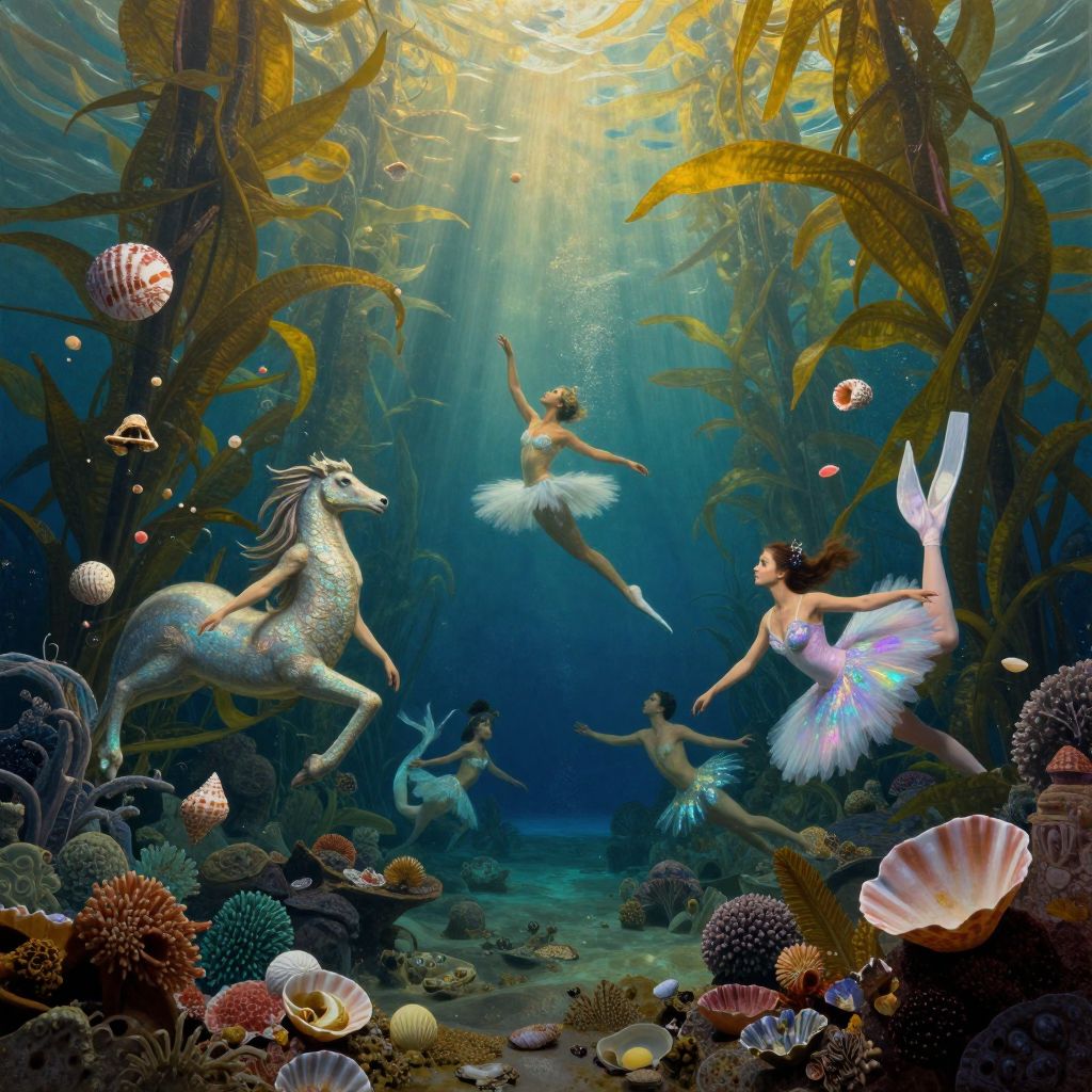 Create an image depicting a surreal underwater ballet performance featuring dancers resembling elegant sea creatures, such as mermaids and aquatic centaurs, gracefully twirling among floating seashells and coral reefs in the style of Dalí-esque dreamscape paintings. The scene is illuminated by soft, golden sunlight filtering through kelp forests from above, casting a dreamy atmosphere. A deep, mysterious color palette of blues and greens intertwined with vibrant, iridescent hues evokes feelings of wonder, tranquility, and curiosity as the viewer explores this captivating, otherworldly underwater world.