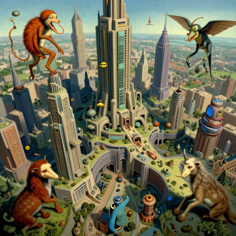 Craft an image that merges surrealism with intricate detailing, portraying a futuristic metropolis where skyscrapers intertwine with fantastical creatures and mythical beasts. Viewed from an aerial perspective akin to a 'bug's-eye view', this scene reveals the peculiar coexistence of technology and nature, blending whimsy with meticulous craftsmanship. The emotional tone of this image balances fascination with unease, inviting viewers to delve into the enigmatic union of science fiction and fantasy in a harmonious setting that reflects both Salvador Dali's dreamlike visions and Hieronymus Bosch's intricate artistry.