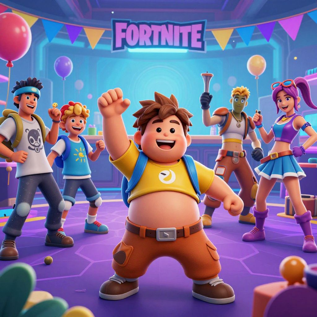 Fat Fortnite kid playing with friends at a lively gaming party, bright Fortnite-themed decorations, joyful atmosphere, diverse kids in colorful outfits, animated style with exaggerated expressions and playful details