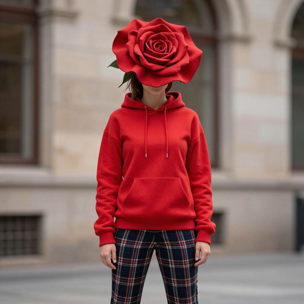 Photograph of a person wearing a red hoodie and plaid pants, with a large red rose head covering their face, standing in front of a blurred