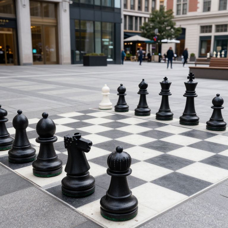 A photograph of an outdoor chessboard with large black and white checkered squares. The board is set on a gray stone plaza, with black chess pieces in the foreground, including a knight, rook, and bishop. A solitary white pawn is placed in the middle. In the background, people walk past modern glass and brick buildings, with trees and outdoor seating visible. The image has a bright, high-contrast color palette, emphasizing the chess pieces against the urban setting.