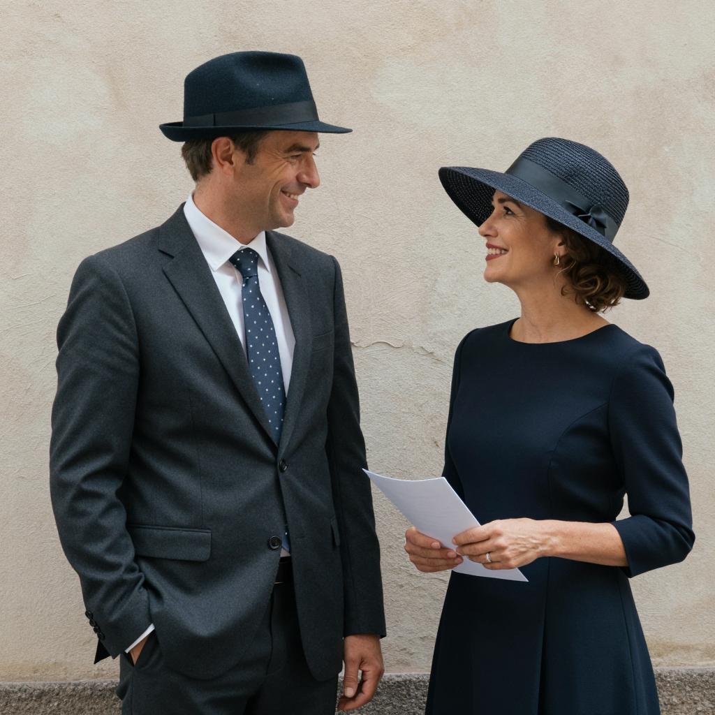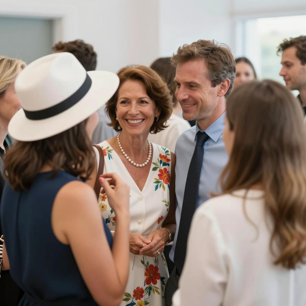 A group of adults engaged in conversation at a bright indoor social event. A woman with short brown hair, wearing a white floral dress and pearl necklace, smiles warmly while standing close to a man in a blue shirt and black tie. Another woman in a white hat and blue dress gestures while talking. Other people are visible in the background, slightly out of focus, adding to the lively atmosphere.