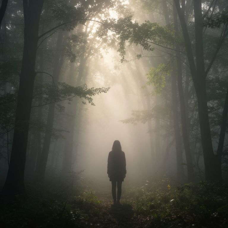Photograph of a lone, silhouetted person with shoulder-length hair standing in a misty forest, sunlight beams filtering through tall trees.