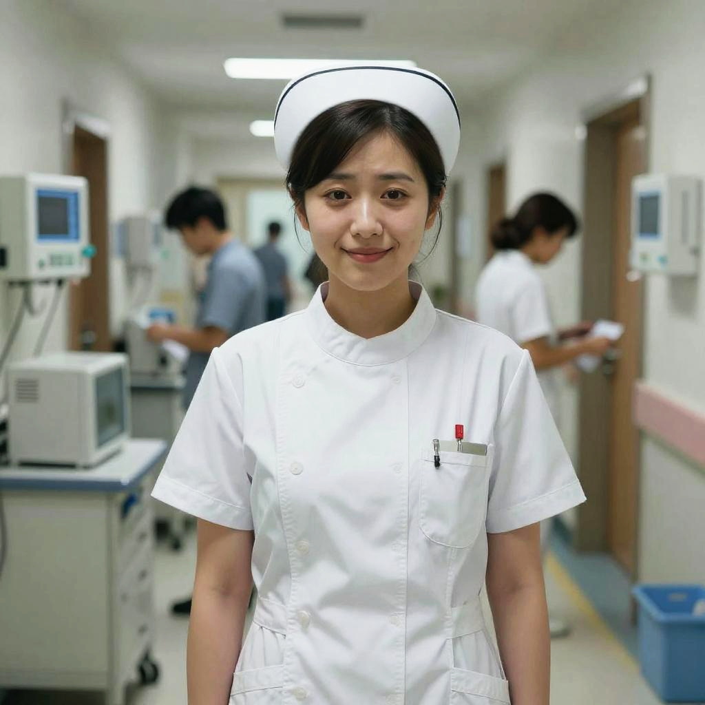 Photograph of an Asian female nurse with black hair, wearing a white uniform and nurse cap, standing in a blurred hospital corridor with other nurses in the