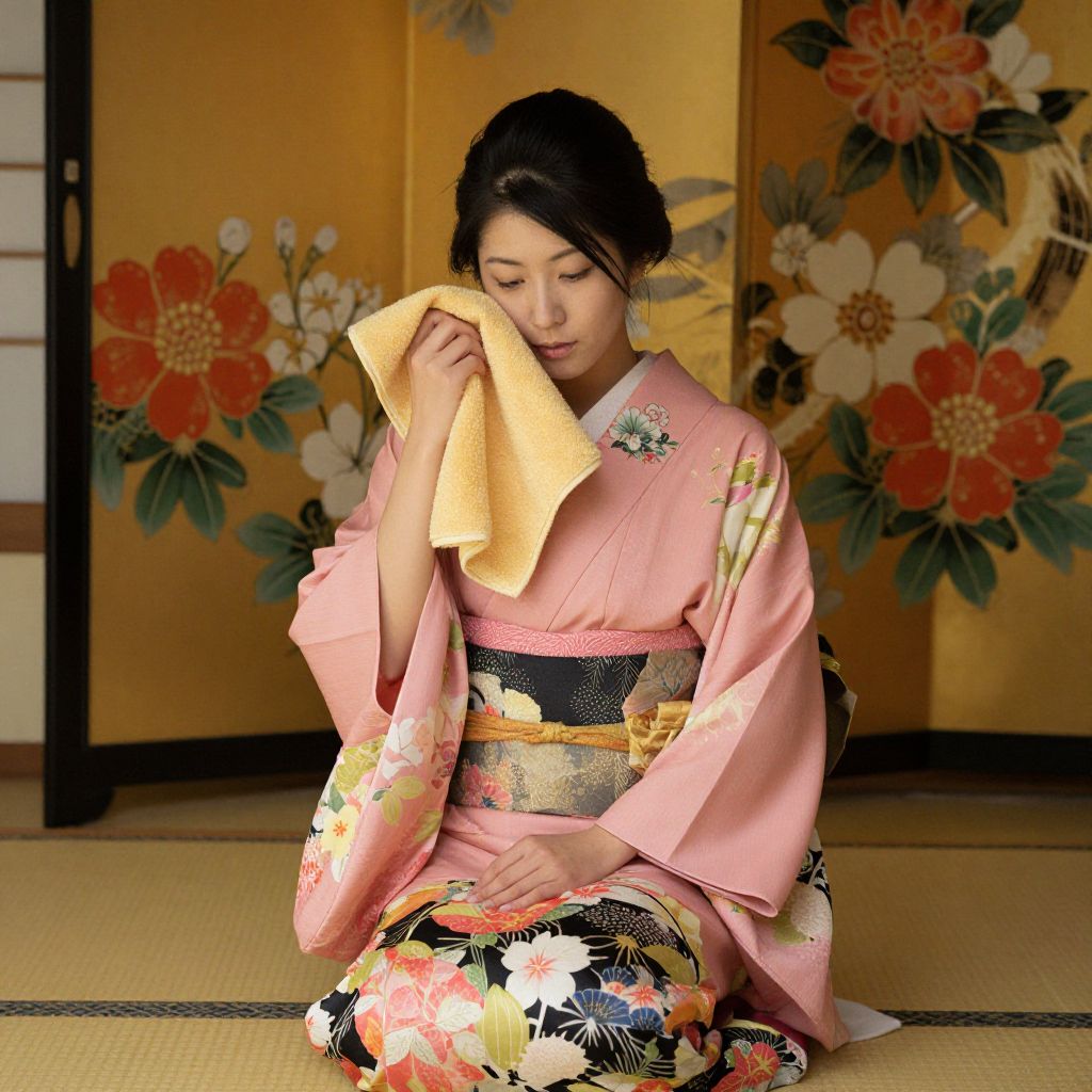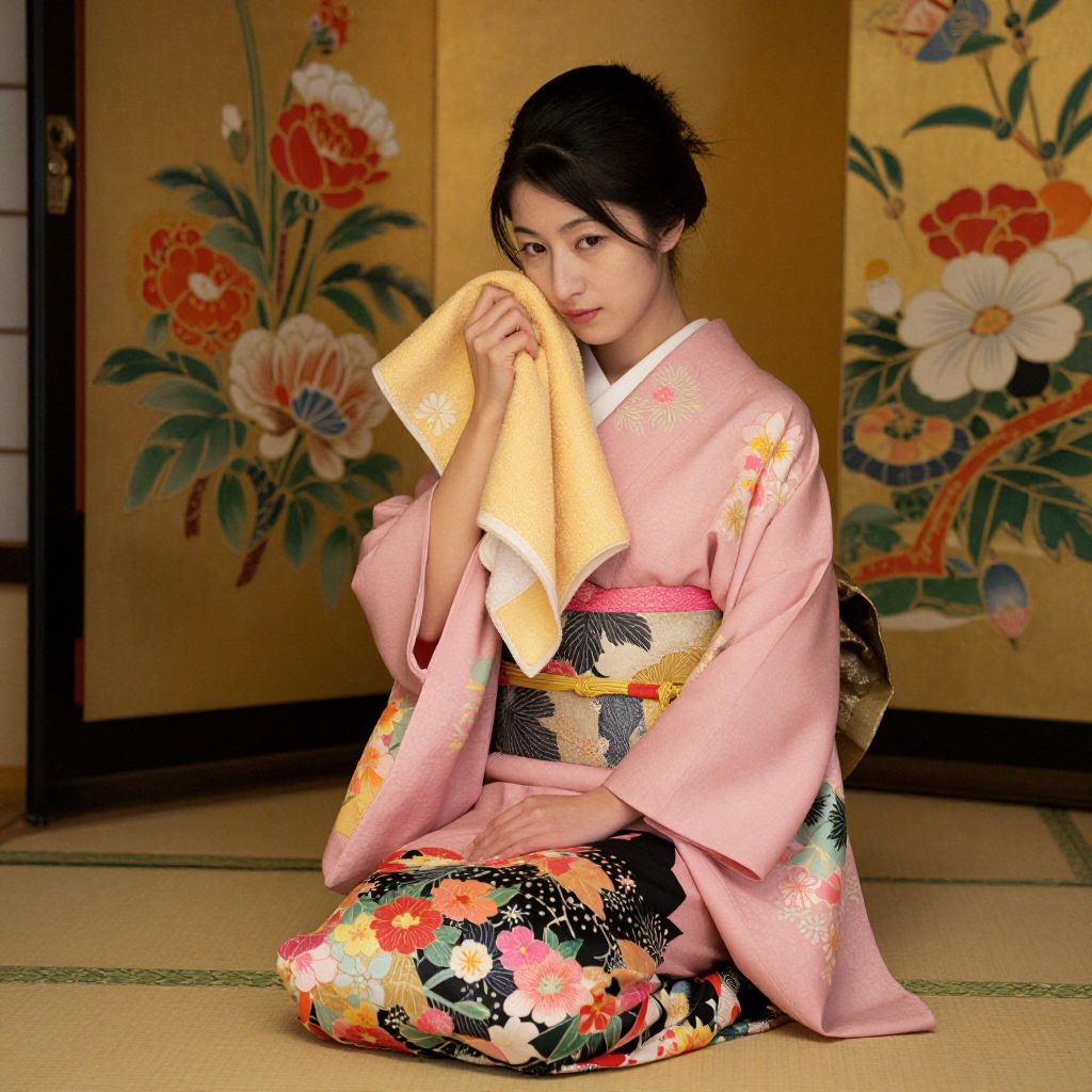 Seated gracefully in a traditional Japanese room, a woman adorned in a flowing pink kimono and a black obi with floral patterns holds a golden-yellow towel to her face, her gaze directed downward in contemplation, framed by a decorative shoji screen featuring vibrant floral designs.