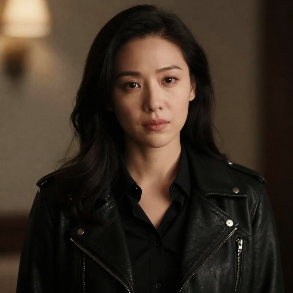 Famous Movie Characters Female Halloween, a close up of a woman in a black shirt and leather jacket