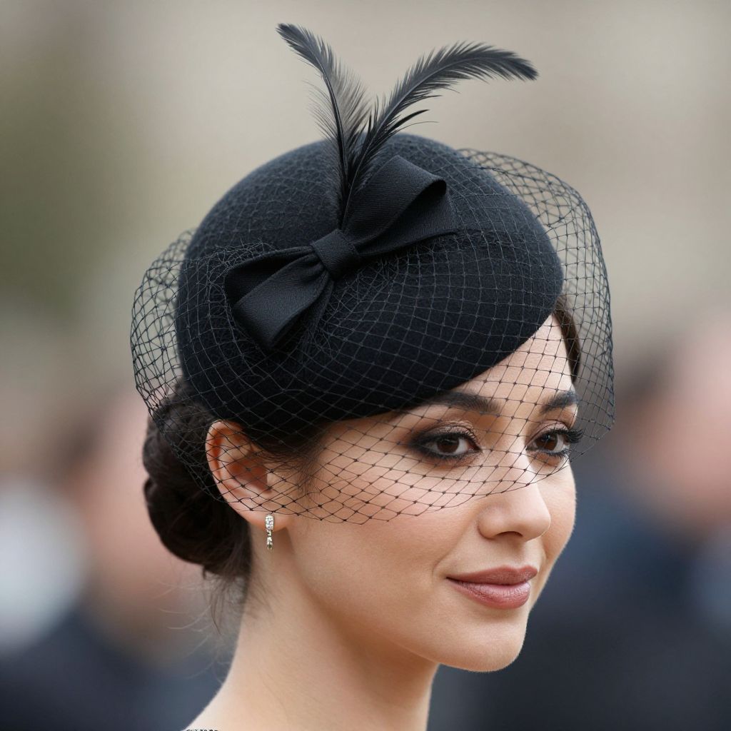 Elegant woman wearing a black wool pillbox hat adorned with a bow and feathers, complemented by a delicate veil, styled for a sophisticated winter wedding or formal event.