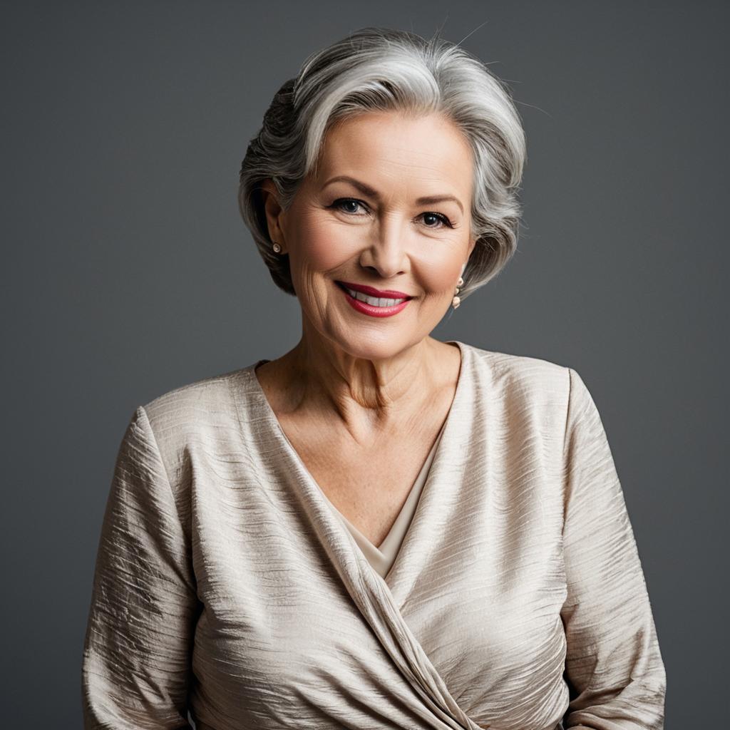 Dress senior woman, photorealistic portrait, elderly woman, short silver hair, smiling, wearing long-sleeved beige dress, dress tied at waist, soft fabric, subtle wrinkles on skin, neutral gray background with ure, standing pose, studio lighting, realistic detail, calm expression, gentle smile, mature beauty, portrait photography, realistic ures, soft lighting