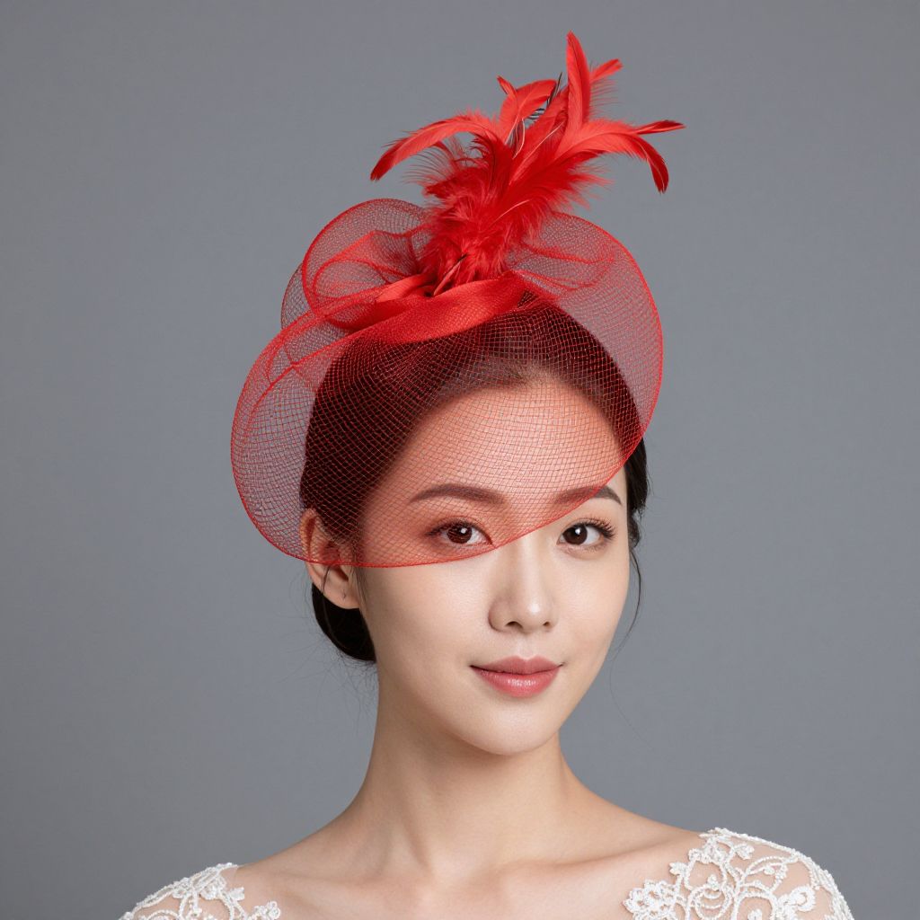 Elegant Bride in Red Feather Fascinator