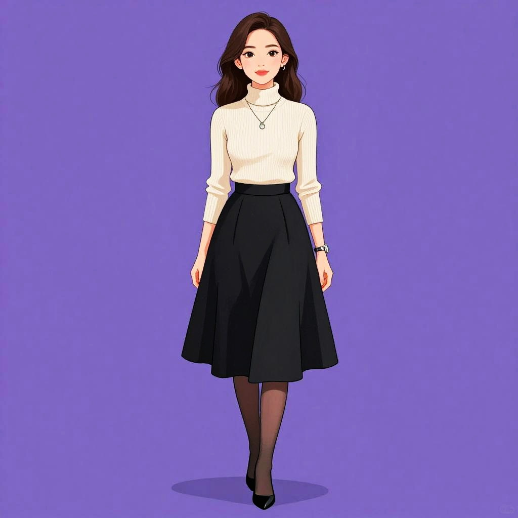 This digital anime-style drawing depicts a young woman with fair skin and long, straight brown hair. She wears a black, short-sleeved dress with puffed shoulders and a frilled hem, buttoned down the front. She has large, expressive eyes with dark eyeliner, a small nose, and a gentle smile. Her ears are adorned with small, round earrings. The background is a gradient from light purple at the top to white at the bottom. The overall style is clean and colorful, with bold outlines and a simple, yet charming aesthetic.