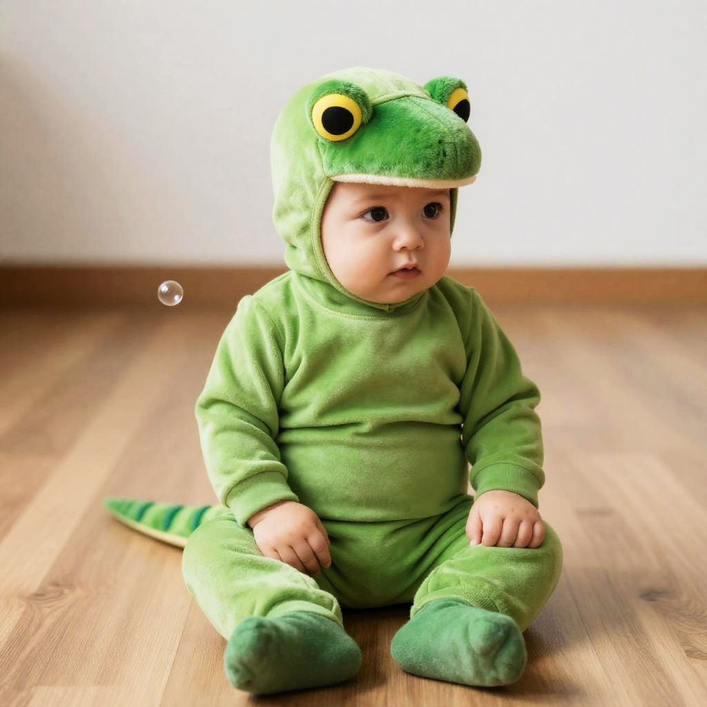 Toddler Green Rex Bubble, in a green costume sitting on a wooden floor