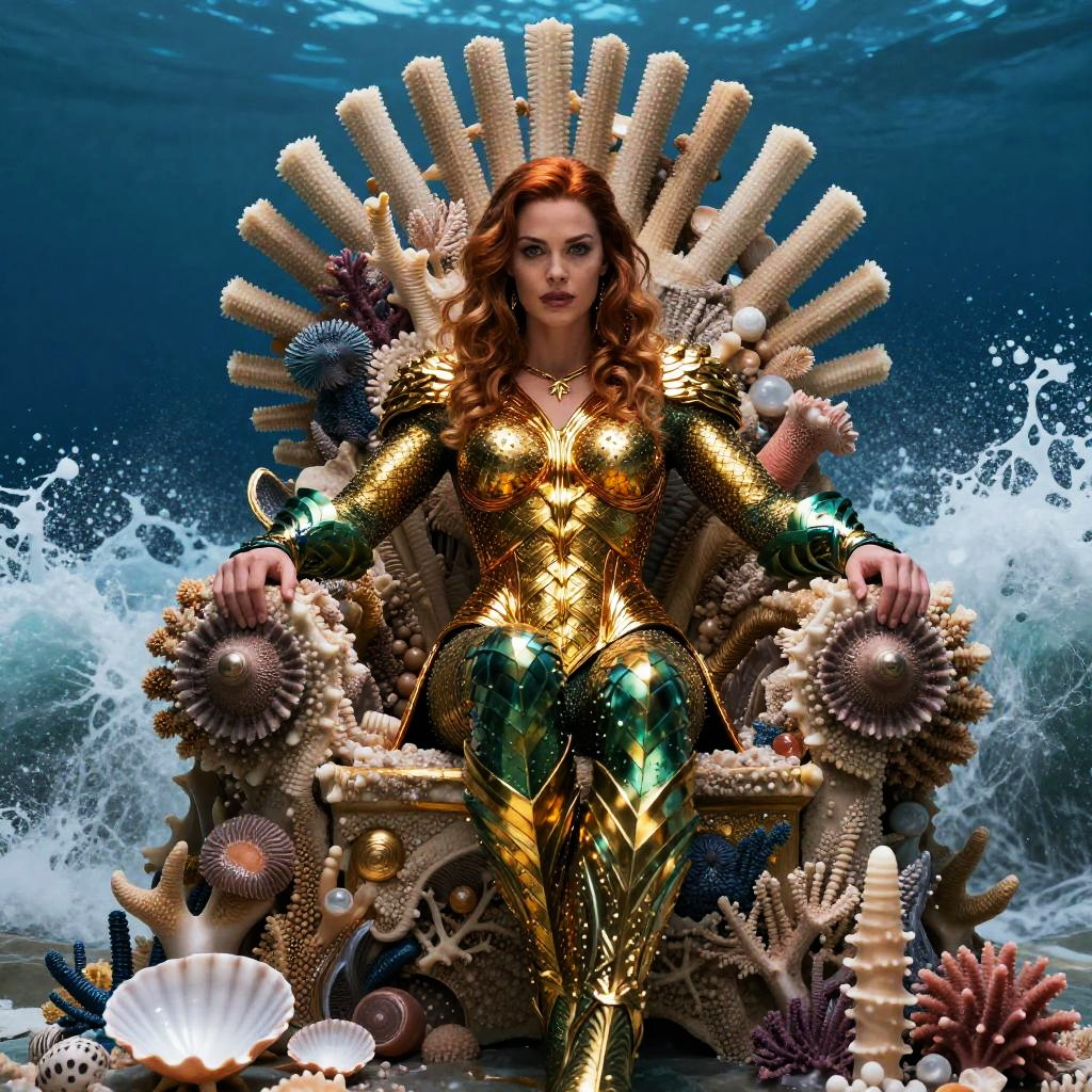 Aquaman actress in regal pose atop a throne made of coral and shells, ocean waves crashing behind, golden armor accented with aquatic motifs, epic fantasy portrait, cinematic atmosphere