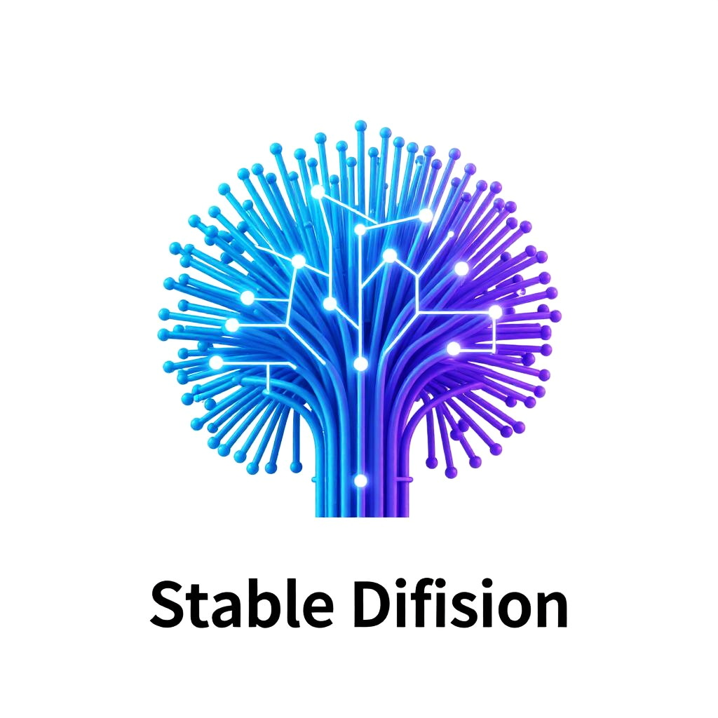 Stable diffusion logo model rendered as a high-tech holographic projection, intertwining fiber optic cables and neural network visuals, vibrant cyan and purple glows, minimalist composition with crisp lines and a tech startup branding feel.