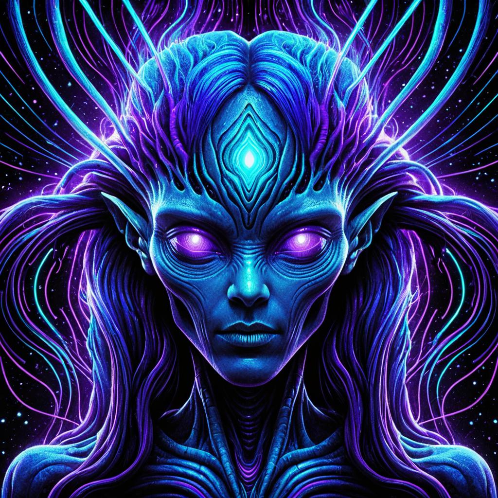 Close-up digital illustration of a wolf's face featuring flowing purple and aqua fur. The wolf has intense purple eyes and is surrounded by glowing, magical soundwave patterns, creating a surreal and dreamlike atmosphere symbolizing conscious awakening. Intricate details enhance the mystical and otherworldly aesthetic.