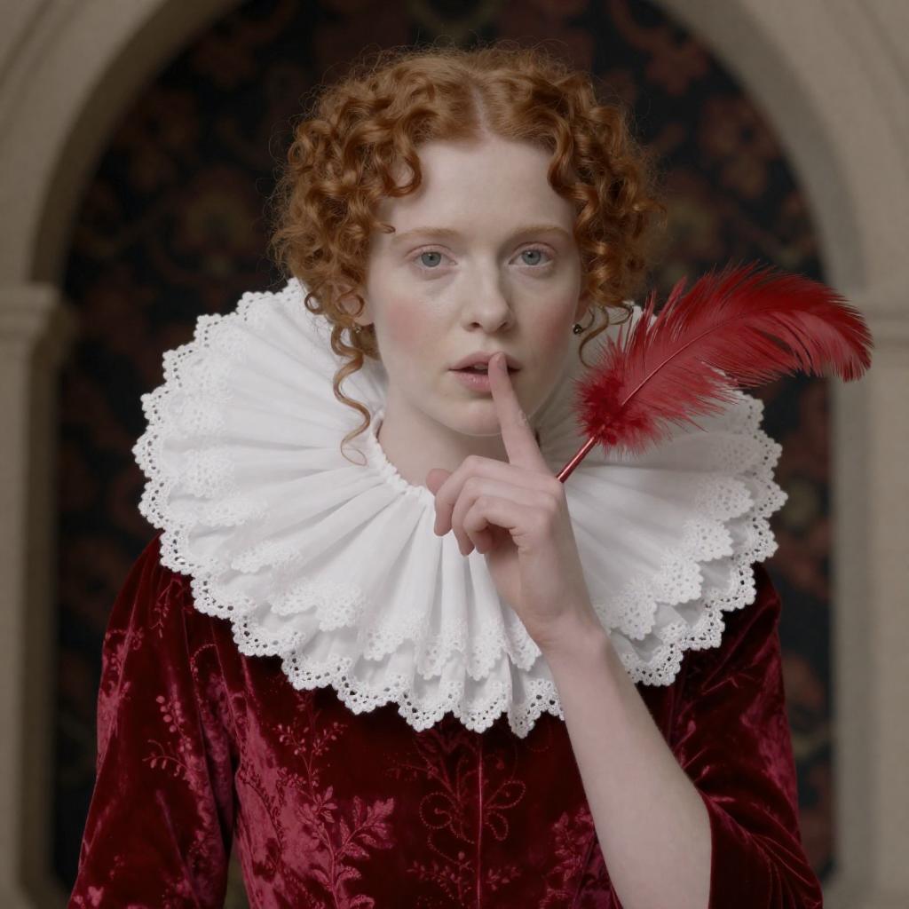 Photograph of a pale-skinned woman with red curly hair adorned with pearl-like beads. She wears an elaborate, multi-layered pearl ruff collar and a silver, patterned gown with large bows. Her blue eyes gaze slightly to the side, and she has a calm expression. The background is a blurred mix of red and gray.