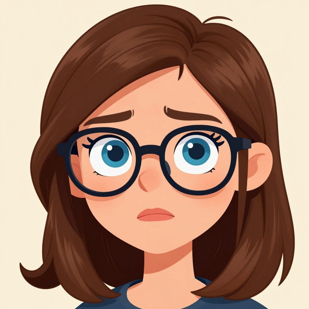 Digital illustration of a concerned young woman with large blue eyes, brown shoulder-length hair, and black glasses, against a white background.
